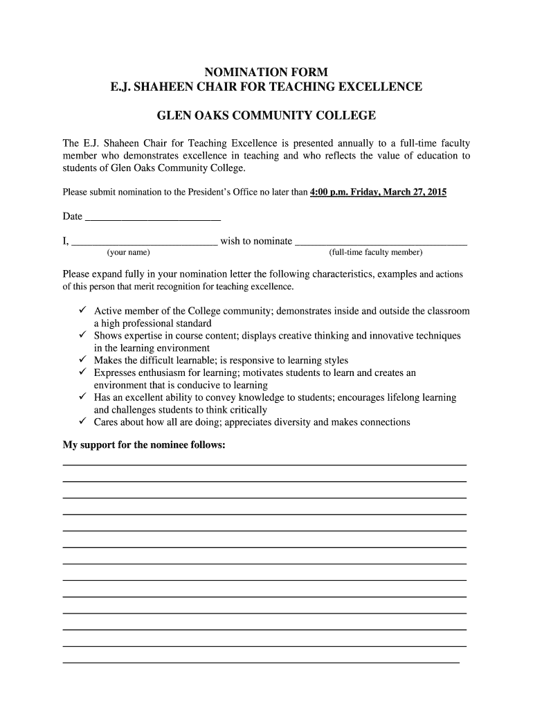 NOMINATION FORM E.J. SHAHEEN CHAIR FOR TEACHING EXCELLENCE GLEN OAKS COMMUNITY COLLEGE The E.J. Shaheen Chair for Teaching Excellence is presented annually to a full time faculty member who demonstrates
