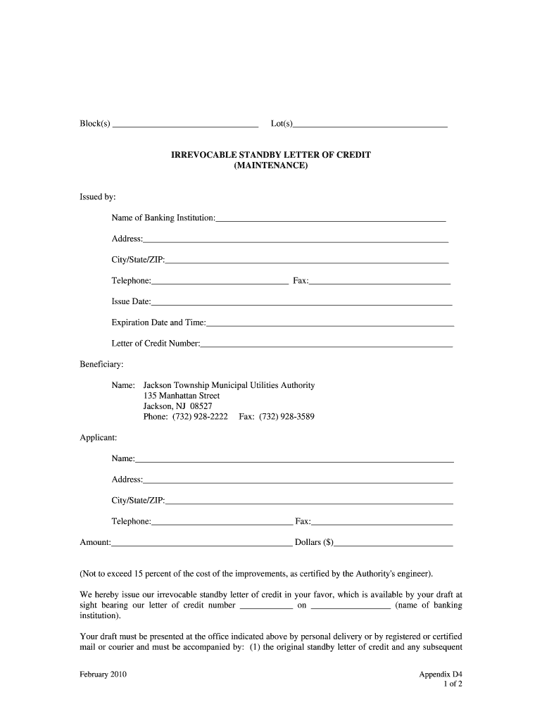 Block(s) Lot(s) IRREVOCABLE STANDBY LETTER OF CREDIT (MAINTENANCE) Issued by: Name of Banking Institution: Address: City/State/ZIP: Telephone: Fax: Issue Date: Expiration Date and Time: Letter of