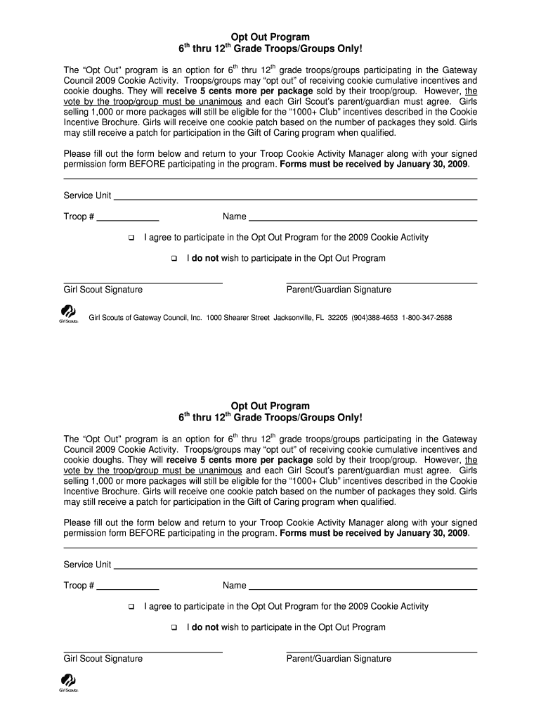 It is imperative for troops to file or submit the Girl Scouts Opt Out Program Form by the deadline of January 30, 2009. Late submissions can lead to complications or may nullify the opt-out request entirely. To ensure timely submission, parents and guardians might benefit from setting reminders well in advance of this date, helping to avoid any potential issues with the process and adherence to the guidelines outlined in the girl scouts permission form.
