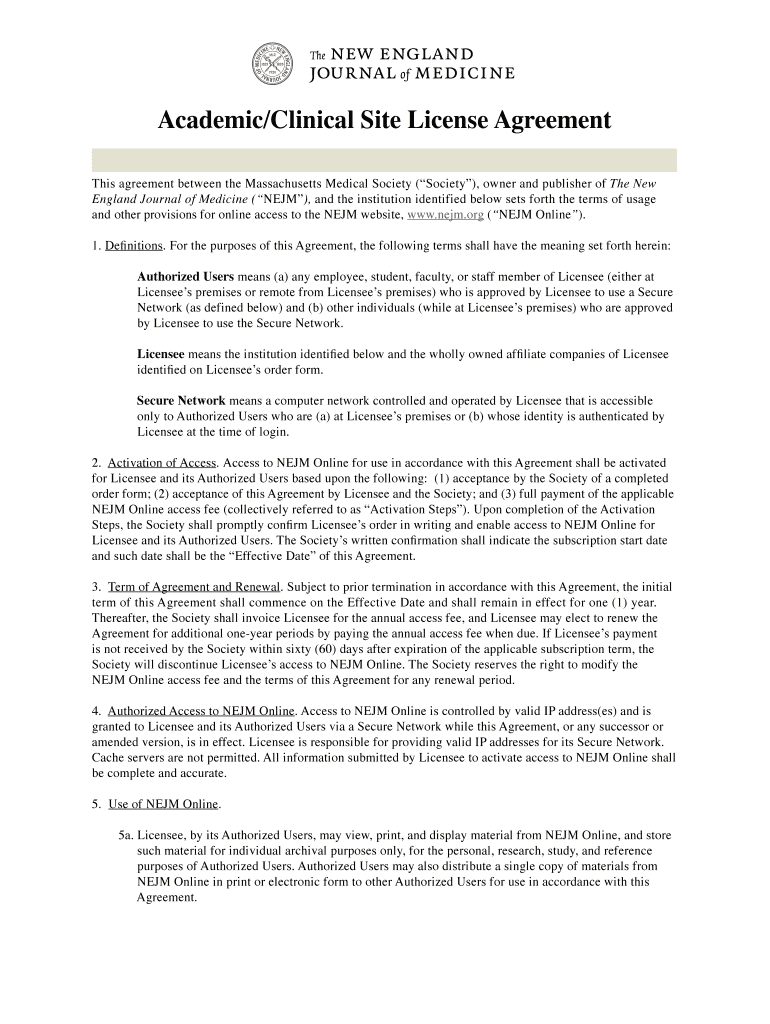 This agreement between the Massachusetts Medical Society (Society), owner and publisher of The New