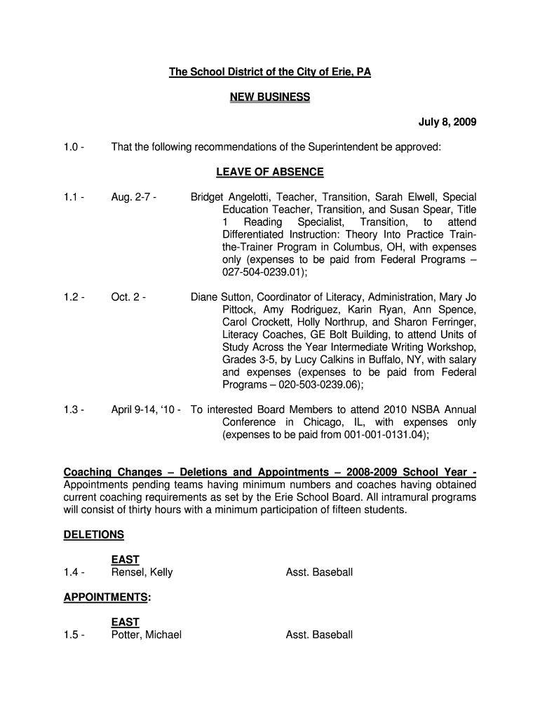 The School District of the City of Erie, PA NEW BUSINESS July 8, 2009 1.0 That the following recommendations of the Superintendent be approved: LEAVE OF ABSENCE 1.1 Aug. 27 Bridget Angelo, Teacher,