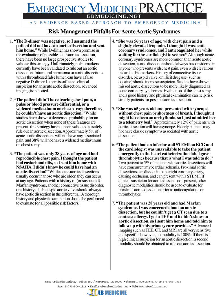 EMERGENCY MEDICINE PRACTICE. MEDICINE NET AN EVIDENCEBASED APPROACH TO EMERGENCY MEDICINE Risk Management Pitfalls For Acute Aortic Syndromes 1. The Dimer was negative, so I assumed the patient did