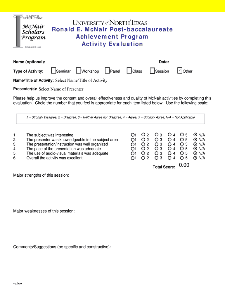 Ronald E. McNair Postbaccalaureate Achievement Program Activity Evaluation Name (optional): Type of Activity: Seminar Workshop Panel Class Date: Session Other Name/Title of Activity: Select Name/Title