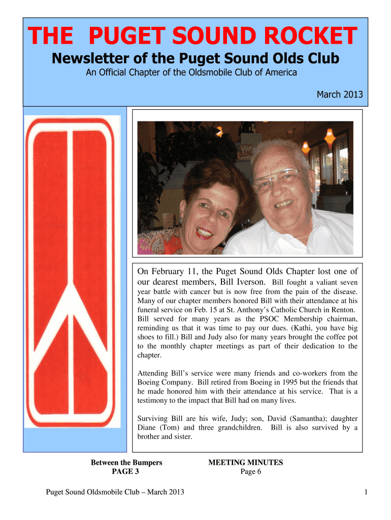THE PUGET SOUND ROCKET Newsletter of the Puget Sound Olds Club An Official Chapter of the Oldsmobile Club of America March 2013 On February 11, the Puget Sound Olds Chapter lost one of our dearest
