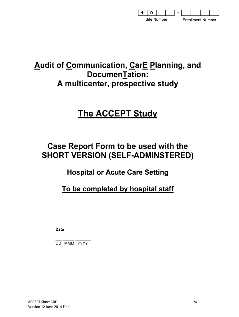 1 0 Site Number Enrollment Number Audit of Communication, Care Planning, and Documentation: A multi center, prospective study The ACCEPT Study Case Report Form to be used with the SHORT VERSION (SELFADMINSTERED)