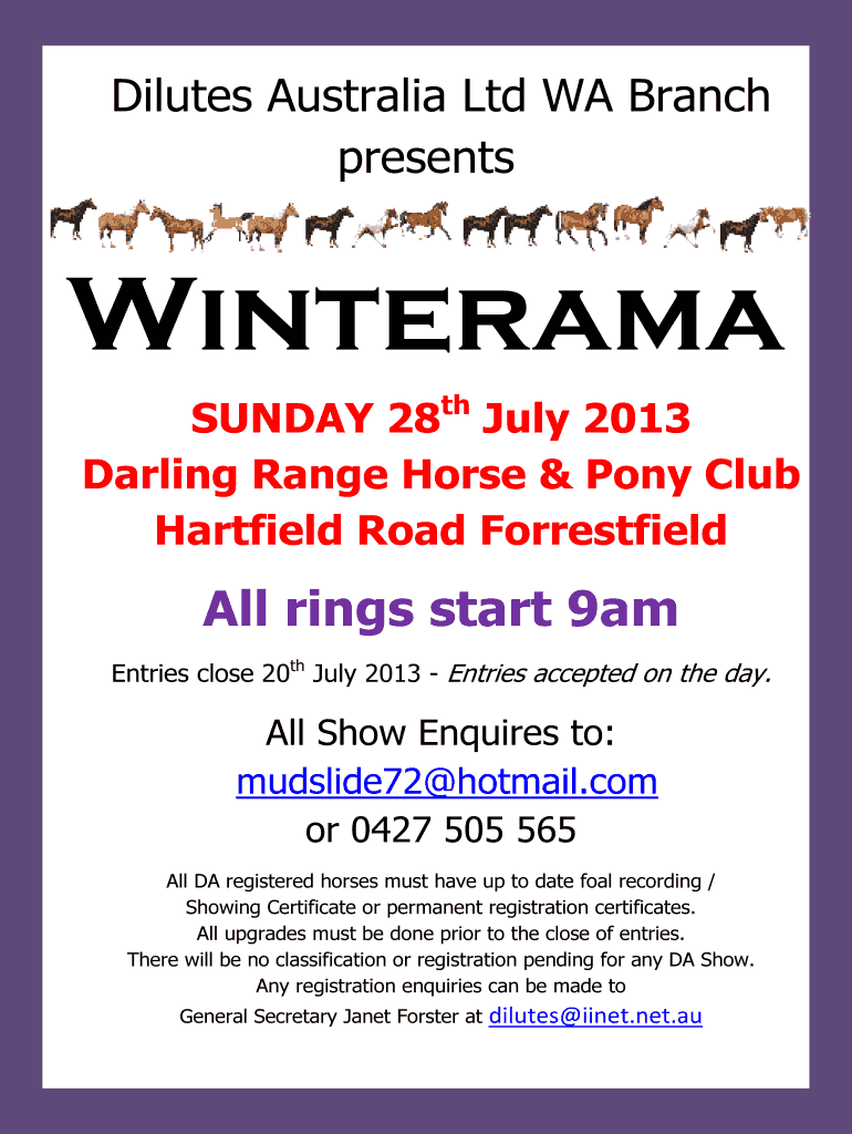 Dilutes Australia Ltd WA Branch presents Cinerama TH SUNDAY 28 July 2013 Darling Range Horse & Pony Club Hatfield Road Forrest fields All rings start 9am Entries close 20th July 2013 Entries accepted