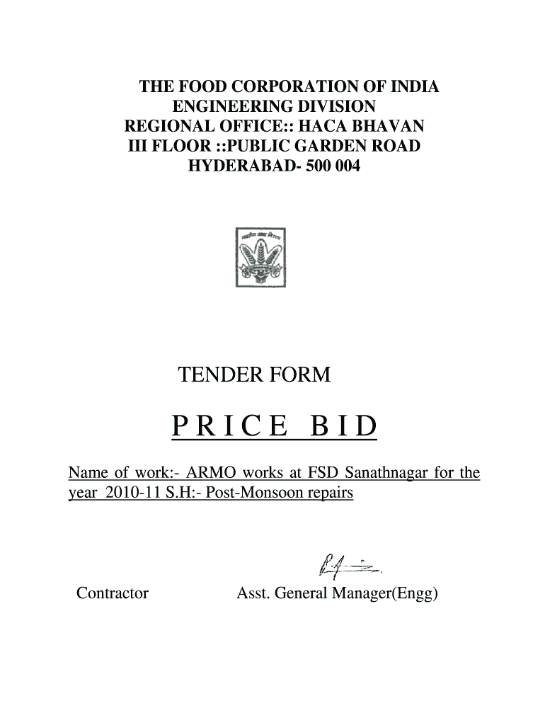THE FOOD CORPORATION OF INDIA ENGINEERING DIVISION REGIONAL OFFICE:: HACK HAVEN III FLOOR ::PUBLIC GARDEN ROAD HYDERABAD 500 004 TENDER FORM PRICE BID Name of work: ARMS works at FSD Sanathnagar for