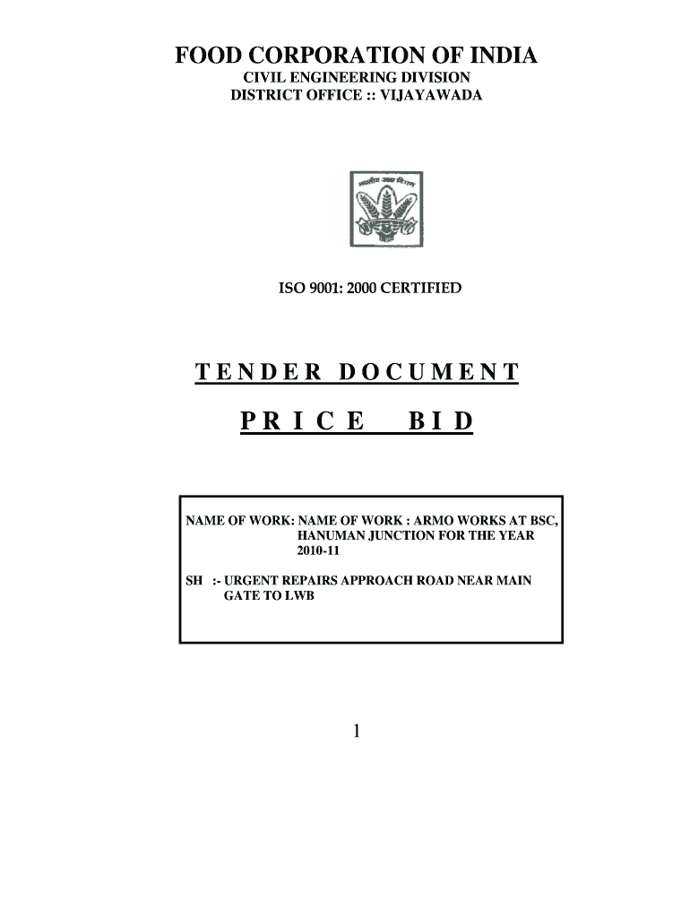 FOOD CORPORATION OF INDIA CIVIL ENGINEERING DIVISION DISTRICT OFFICE :: VIJAYAWADA TENDER DOCUMENT PR I C E BI D NAME OF WORK: NAME OF WORK : ARMS WORKS AT BSC, HANGMAN JUNCTION FOR THE YEAR 201011