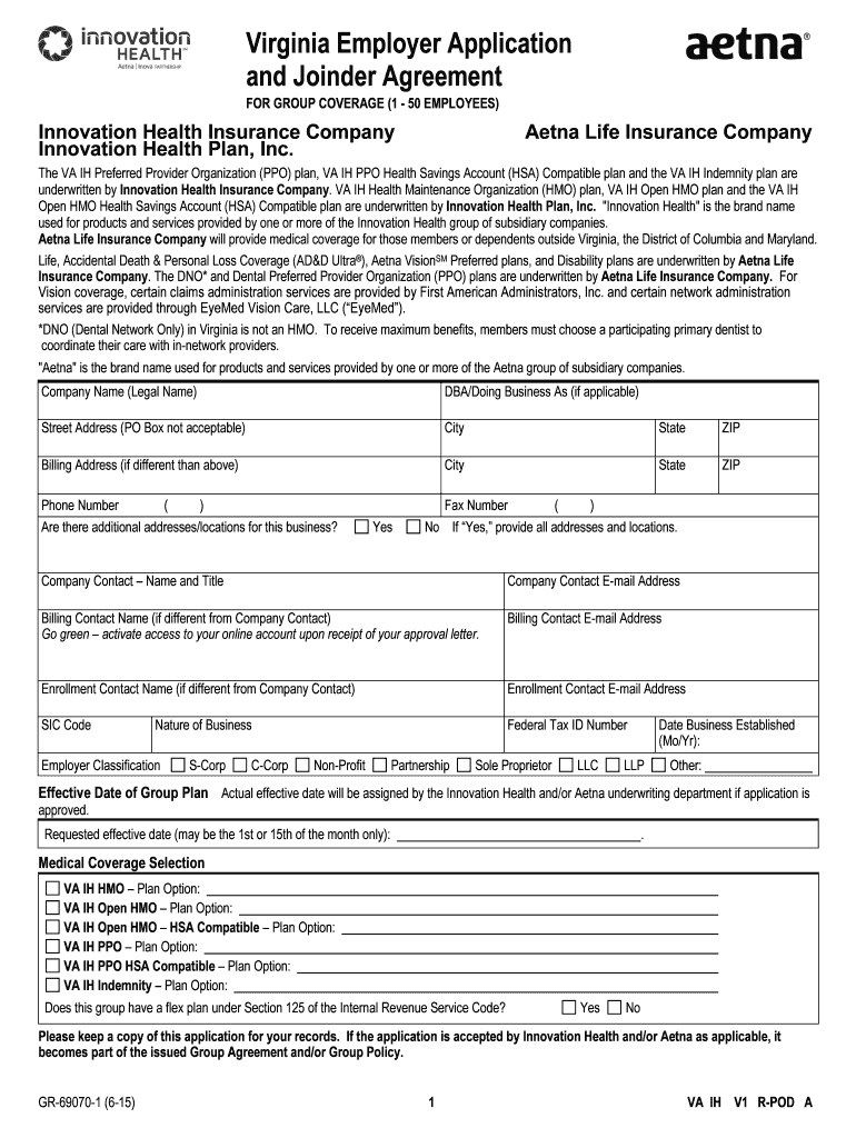 Virginia Employer Application and Joiner Agreement FOR GROUP COVERAGE (1 50 EMPLOYEES) Innovation Health Insurance Company Innovation Health Plan, Inc. Aetna Life Insurance Company The VA IH Preferred