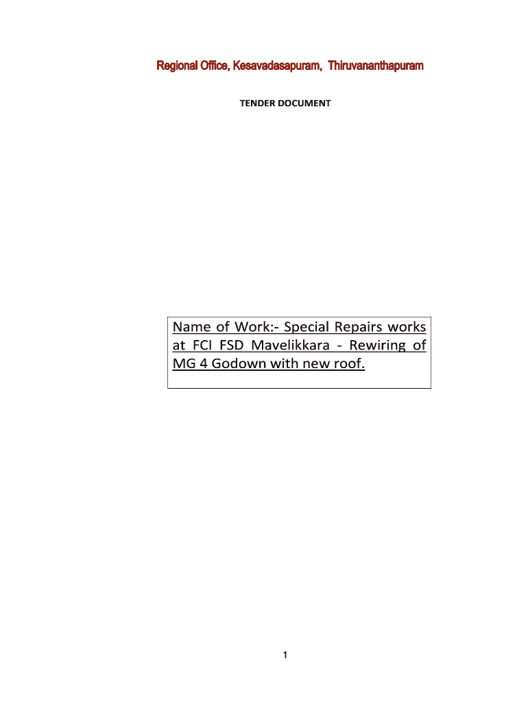 TENDER DOCUMENT Name of Work: Special Repairs works at FCI FSD Mavelikkara Rewiring of MG 4 Go down with new roof. 1 INDEX SL No 1 2 3 4 5 6 7 8 9 10 11 12 13 14 15 16 17 18 19 Description Page Nos