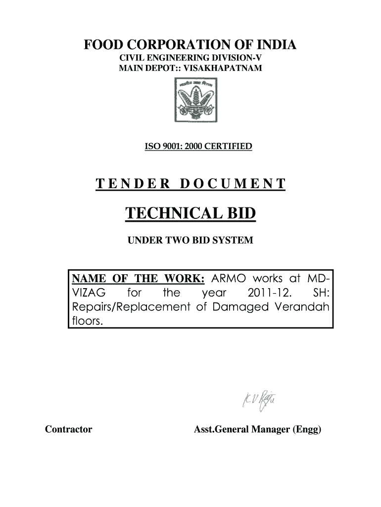 FOOD CORPORATION OF INDIA CIVIL ENGINEERING DIVISION MAIN DEPOT:: VISAKHAPATNAM ISO 9001: 2000 CERTIFIED TENDER DOCUMENT TECHNICAL BID UNDER TWO BID SYSTEM NAME OF THE WORK: ARMS works at MOVING for