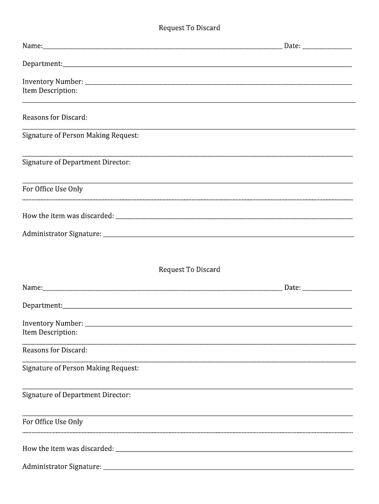 RequestToDiscard Name: Date: Department: InventoryNumber: ItemDescription: ReasonsforDiscard: SignatureofPersonMakingRequest: SignatureofDepartmentDirector: ForOfficeUseOnly ............................................................................................................................................................................