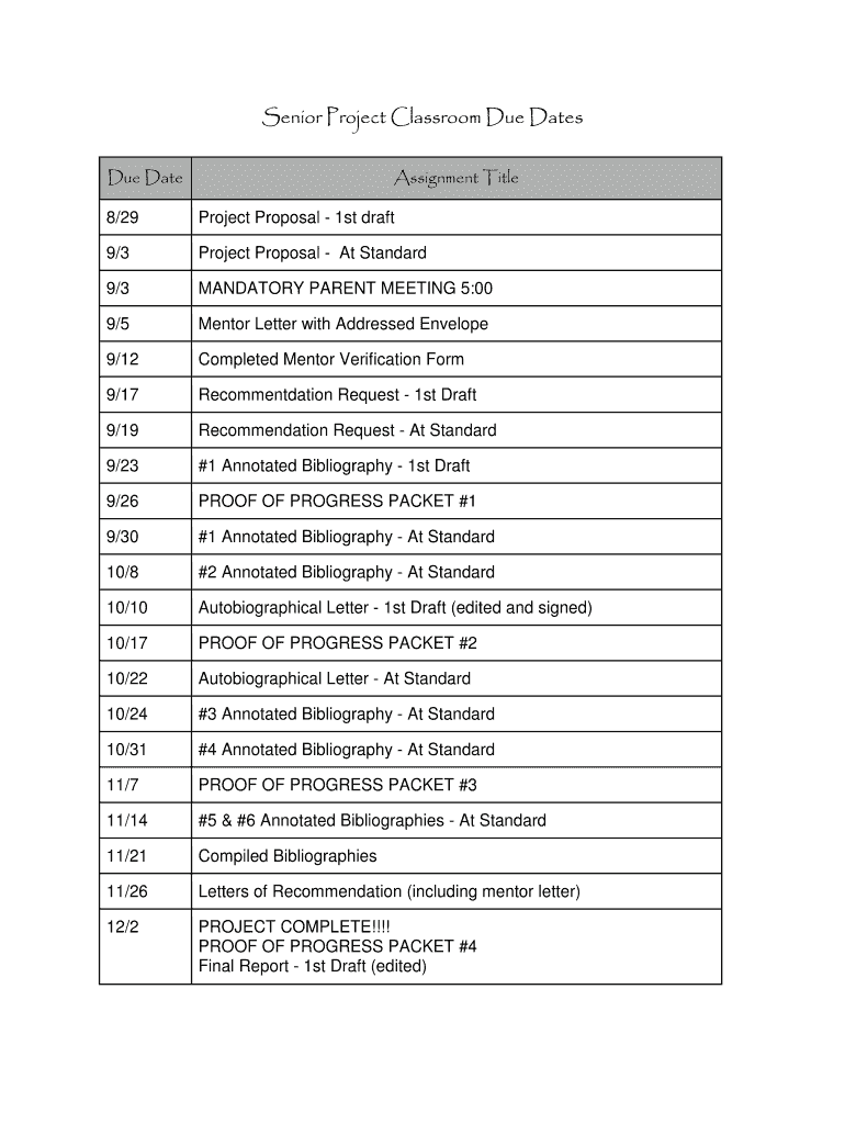 Senior Project Classroom Due Dates Due Date Assignment Title 8/29 Project Proposal 1st draft 9/3 Project Proposal At Standard 9/3 MANDATORY PARENT MEETING 5:00 9/5 Mentor Letter with Addressed Envelope