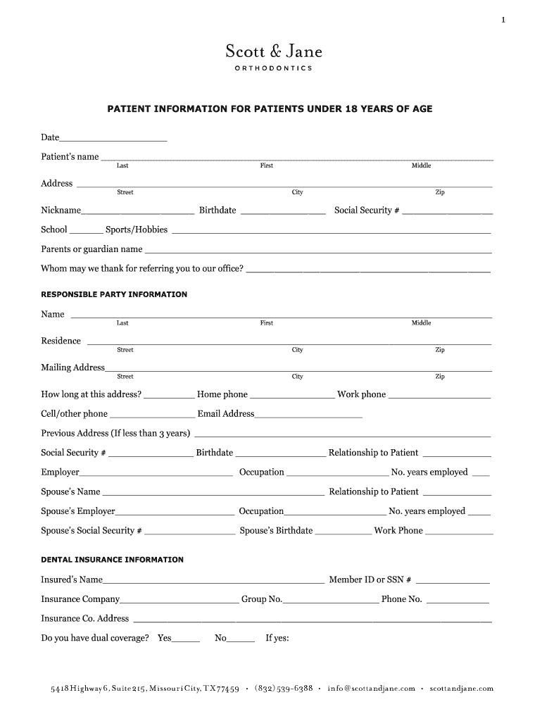 1 PATIENT INFORMATION FOR PATIENTS UNDER 18 YEARS OF AGE Date Patients name Last First Middle Address Street City Zip Nickname Birthdate Social Security # School Sports/Hobbies Parents or guardian