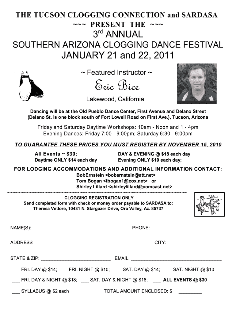 THE TUCSON CLOGGING CONNECTION and SARCASM PRESENT THE 3rd ANNUAL SOUTHERN ARIZONA CLOGGING DANCE FESTIVAL JANUARY 21 and 22, 2011 Featured Instructor Eric Nice Lakewood, California Dancing will be