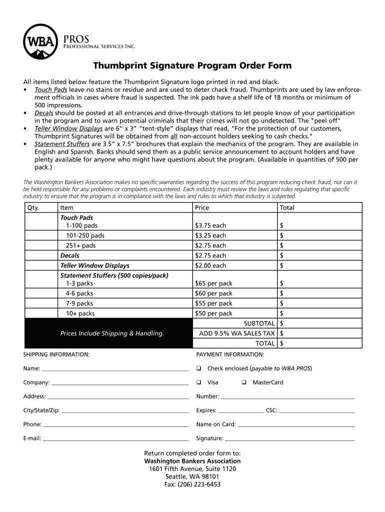 Thumbprint Signature Program Order Form All items listed below feature the Thumbprint Signature logo printed in red and black. Touch Pads leave no stains or residue and are used to deter check fraud.