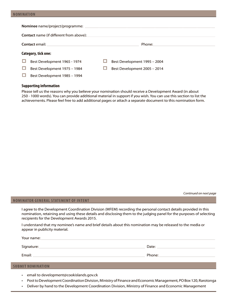 Nomination Form The 2015 Development Awards Honoring 50 Years of Development in the Cook Islands Closing date for nominations is Friday 30th January 2015. There is no limit to the number of nominations