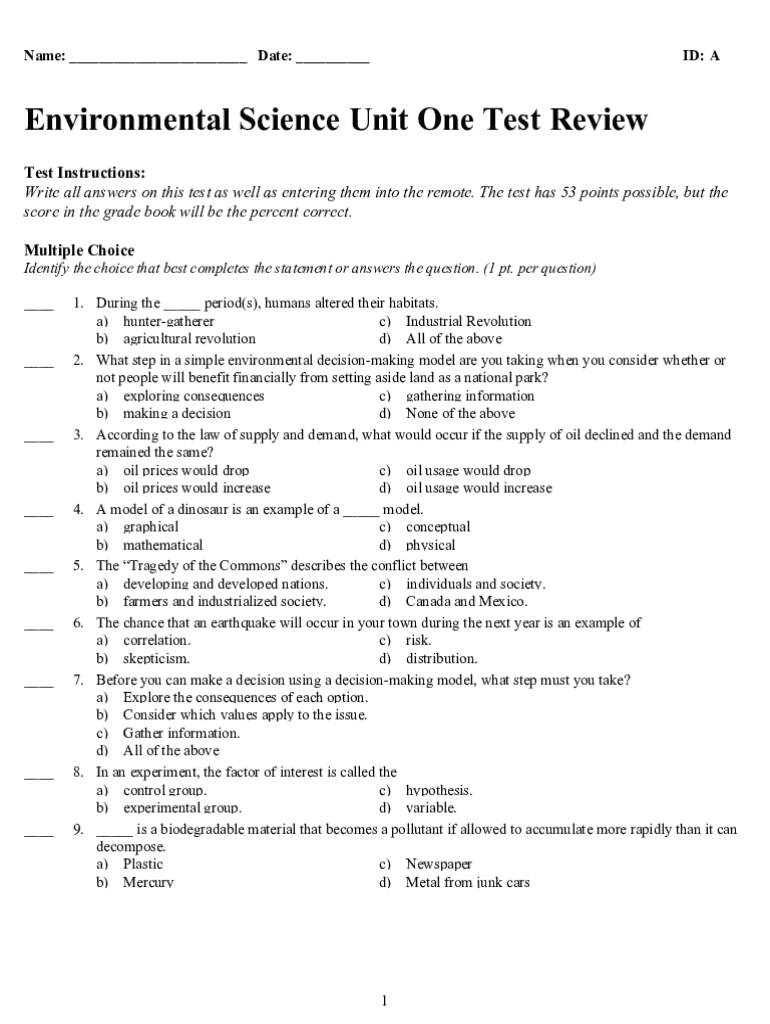 Name: ___ Date: ___ID: AEnvironmental Science Unit One Test Review Test Instructions: Write all answers on this test as well as entering them into the remote. The test has 53 points possible, but the score in the grade book will be the percent correct. Multiple ChoiceIdentify the choice that best completes the statement or answers the question. (1 pt. per question) ___ _________ ___ ___ ______ ___1. During the ___ period(s), humans altered their habitats. a) huntergatherer c) Industrial