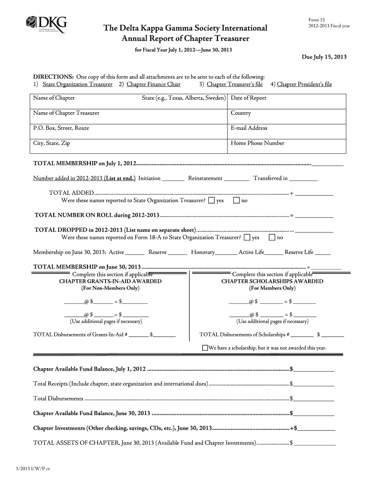 The Delta Kappa Gamma Society International Annual Report of Chapter Treasurer Form 15 20122013 Fiscal year for Fiscal Year July 1, 2012June 30, 2013 Due July 15, 2013, DIRECTIONS: One copy of this