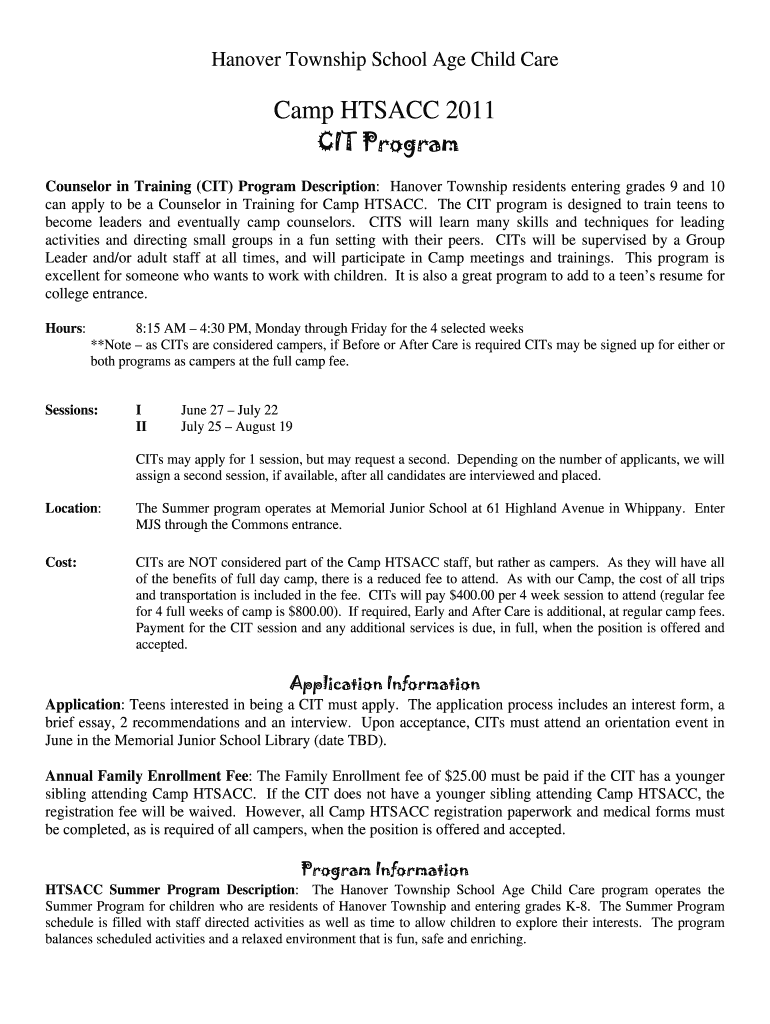 Hanover Township School Age Child Care Camp HTS ACC 2011 CIT Program Counselor in Training (CIT) Program Description: Hanover Township residents entering grades 9 and 10 can apply to be a Counselor