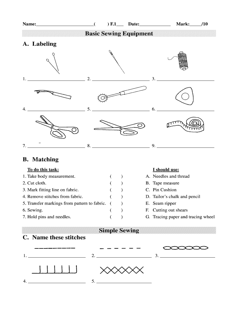 Name: () F.1 Date: Mark: /10 Basic Sewing Equipment A. Labeling 1. 2. 3. 4. 5. 6. 7. 8. 9. B. Matching To do this task: 1. Take body measurement. 2. Cut cloth. (()) I should use: A. Needles and thread