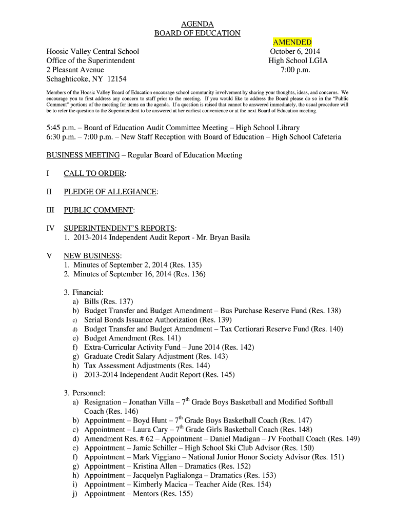 Get the free AGENDA BOARD OF EDUCATION AMENDED - hoosicvalleyk12nyus - hoosicvalley k12 ny