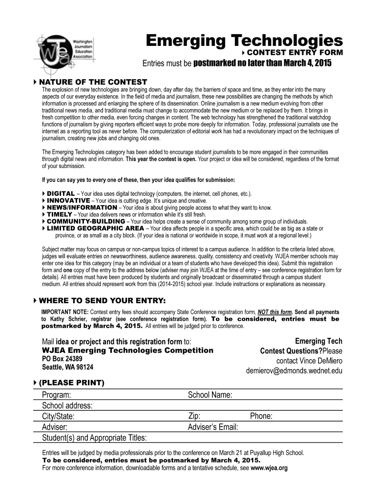 Emerging Technologies contest Entry form Entries must be postmarked no later than March 4, 2015, WAC Nature of the contest The explosion of new technologies are bringing down, day after day, the barriers
