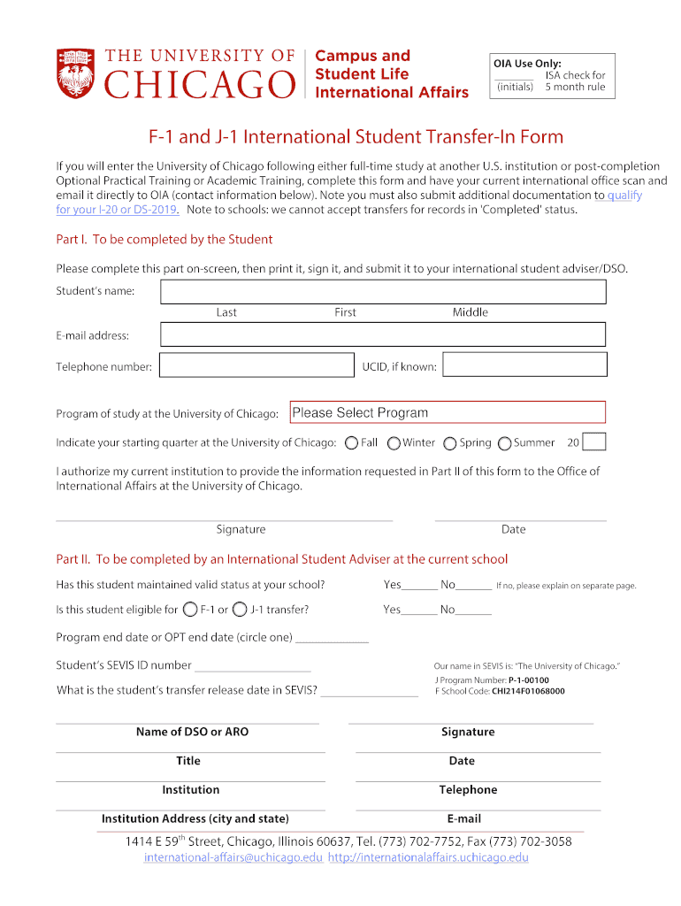 OIL Use Only: ISA check for (initials) 5 month rule F1 and J1 International Student Transfer In Form If you will enter the University of Chicago following either full time study at another U.S. institution