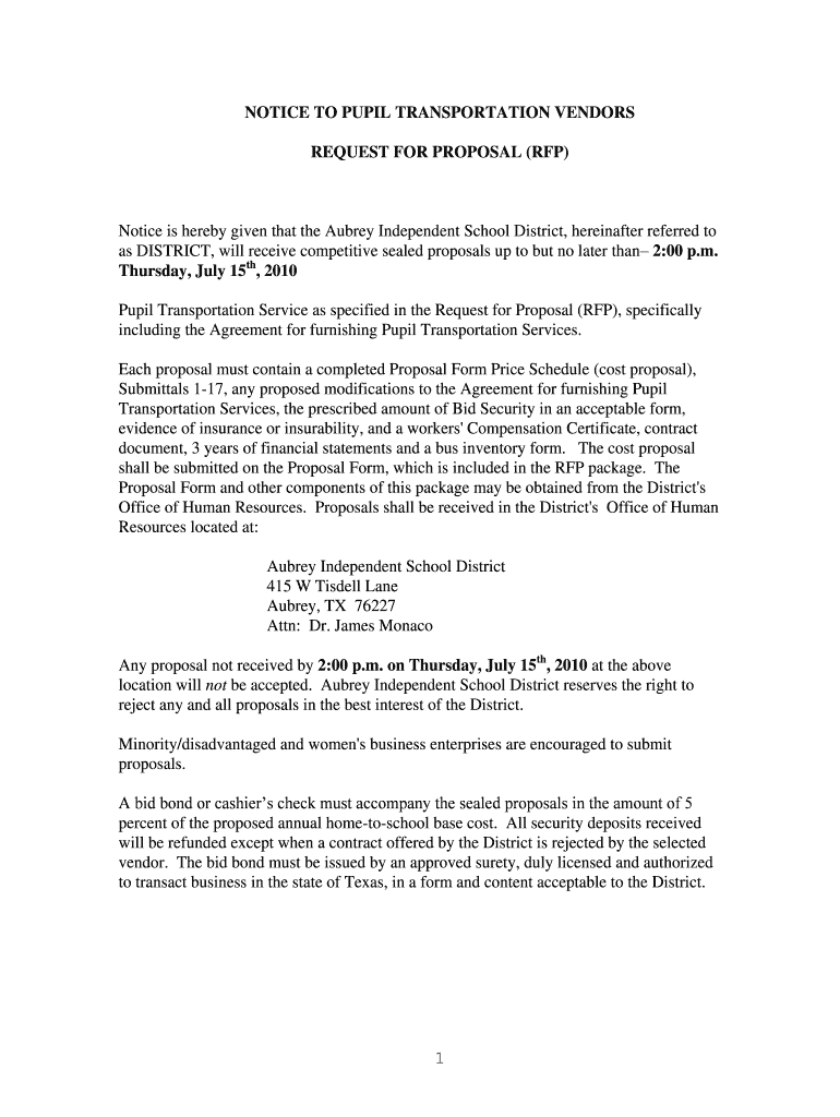 NOTICE TO PUPIL TRANSPORTATION VENDORS REQUEST FOR PROPOSAL (RFP) Notice is hereby given that the Aubrey Independent School District, hereinafter referred to as DISTRICT, will receive competitive