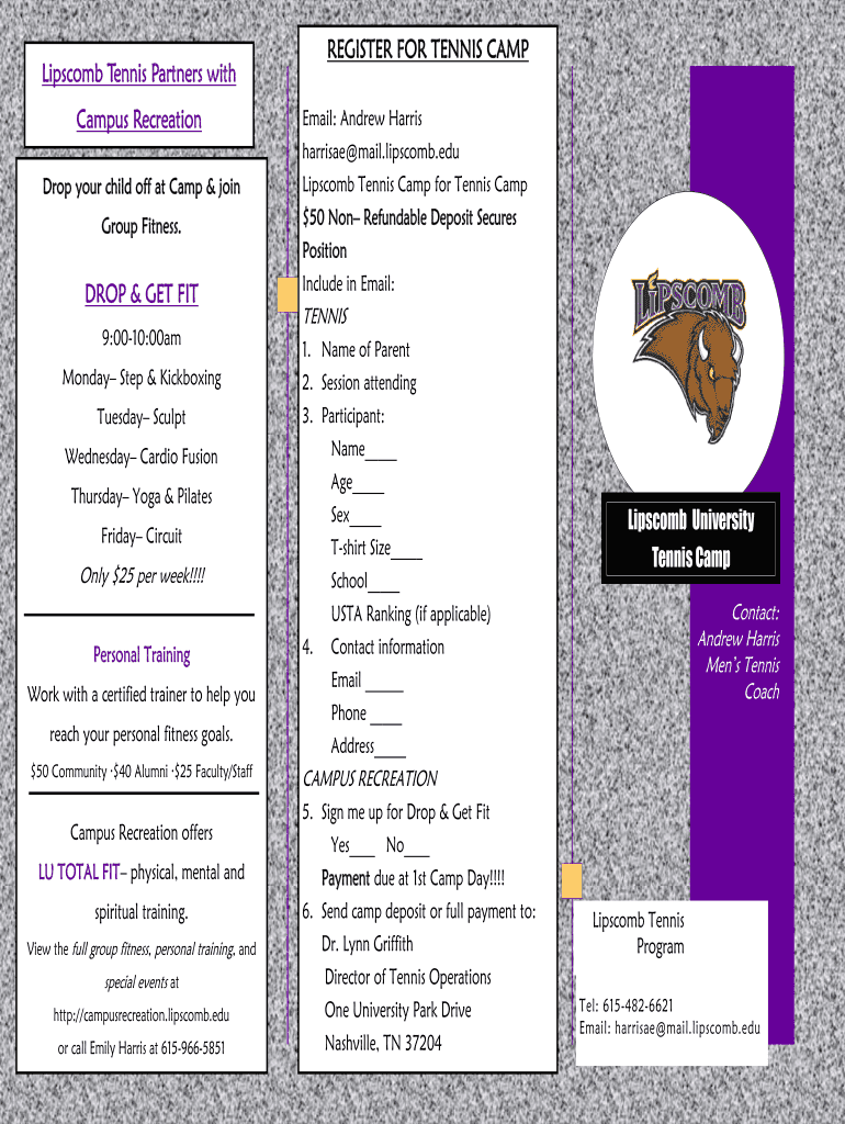 REGISTER FOR TENNIS CAMP Lipscomb Tennis Partners with Campus Recreation Drop your child off at Camp & join Group Fitness. DROP & GET FIT 9:0010:00am Monday Step & Kickboxing Tuesday Sculpt Wednesday