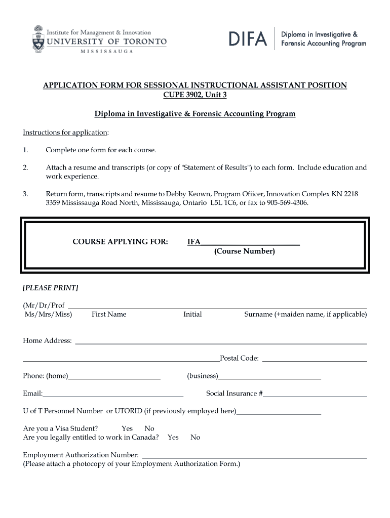 APPLICATION FORM FOR SESSIONAL INSTRUCTIONAL ASSISTANT POSITION CUP 3902, Unit 3 Diploma in Investigative & Forensic Accounting Program Instructions for application: 1. Complete one form for each