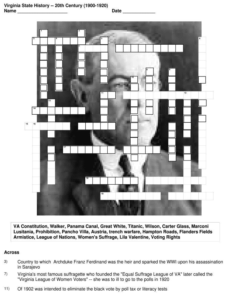 Virginia State History 20th Century (19001920) Name Date 1 2 3 4 5 6 7 8 9 10 11 12 13 14 15 16 17 18 19 VA Constitution, Walker, Panama Canal, Great White, Titanic, Wilson, Carter Glass, Marconi