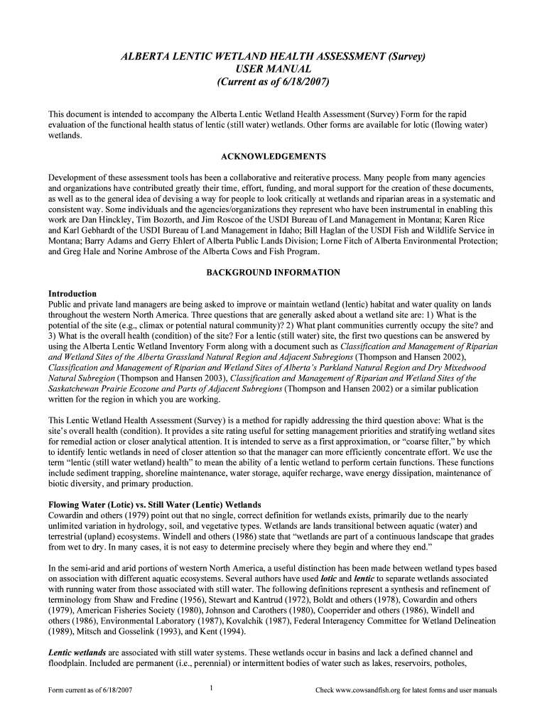 This document is intended to accompany the Alberta Lentil Wetland Health Assessment (Survey) Form for the rapid