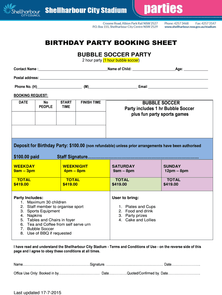 Get the free BIRTHDAY PARTY BOOKING SHEET - shellharbournswgovau