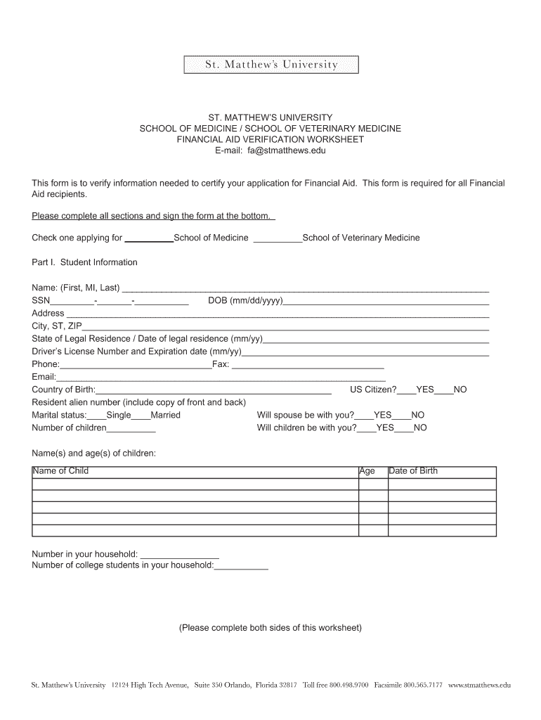 S t. M at t hew s UN over s i t y ST. MATTHEWS UNIVERSITY SCHOOL OF MEDICINE / SCHOOL OF VETERINARY MEDICINE FINANCIAL AID VERIFICATION WORKSHEET Email: fa Matthews.edu This form is to verify information
