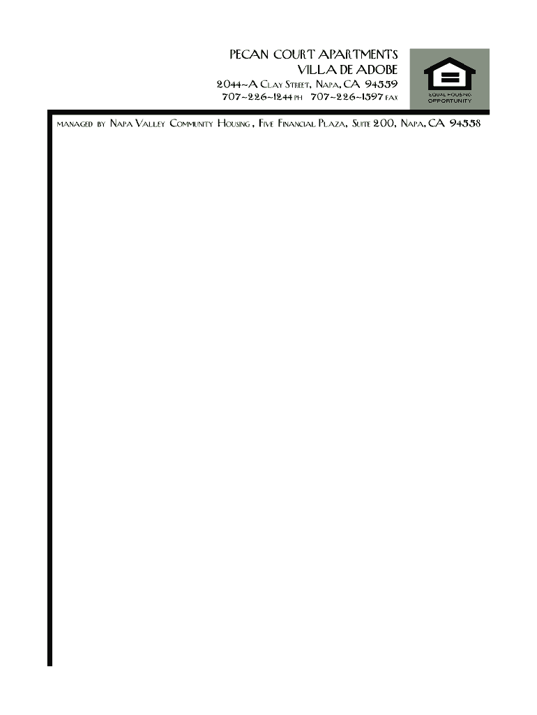 PECAN COURT APARTMENTS VILLA DE ADOBE 2044A Clay Street, Napa, CA 94559 7072261244 pH 7072261597 fax EQUAL HOUSING OPPORTUNITY managed by Napa Valley Community Housing, Five Financial Plaza, Suite