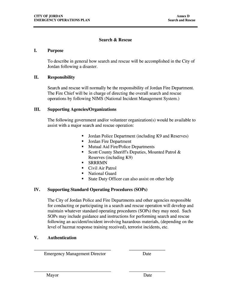 CITY OF JORDAN EMERGENCY OPERATIONS PLAN Annex D Search and Rescue Search & Rescue I. Purpose To describe in general how search and rescue will be accomplished in the City of Jordan following a disaster.