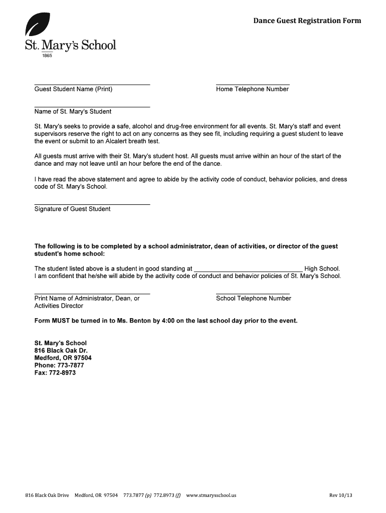 Dance Guest Registration Form Guest Student Name (Print) Home Telephone Number Name of St. Mary's Student St. Mary's seeks to provide a safe, alcohol and drug free environment for all events. St.