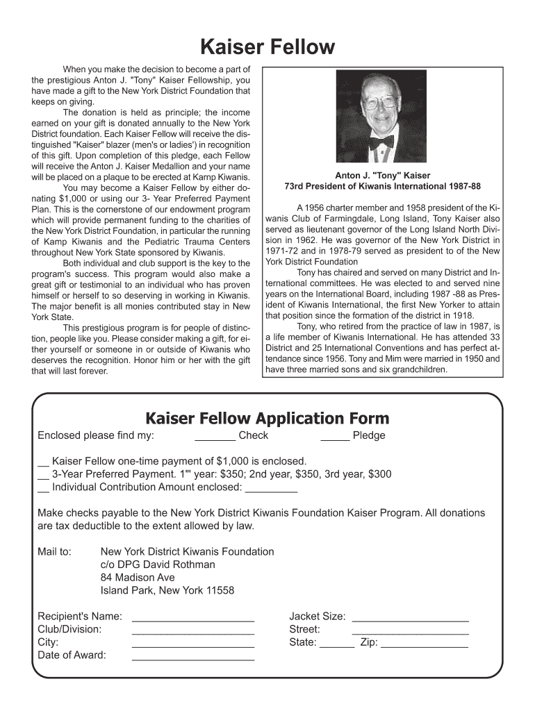 Kaiser Fellow When you make the decision to become a part of the prestigious Anton J. Tony Kaiser Fellowship, you have made a gift to the New York District Foundation that keeps on giving. The donation