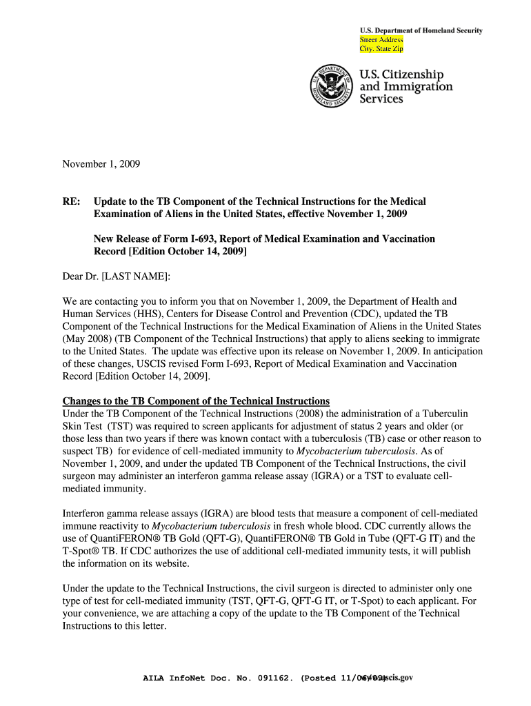 Street Address City, State Zip November 1, 2009, RE: Update to the TB Component of the Technical Instructions for the Medical Examination of Aliens in the United States, effective November 1, 2009,
