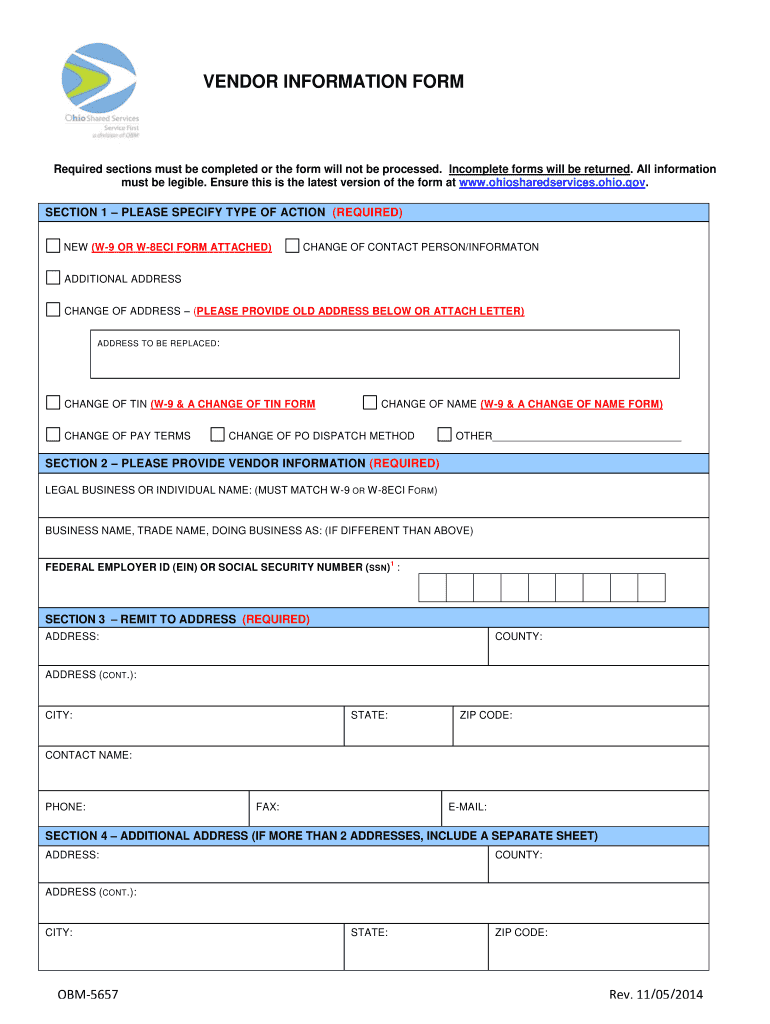 VENDOR INFORMATION FORM Required sections must be completed or the form will not be processed. Incomplete forms will be returned. All information must be legible. Ensure this is the latest version