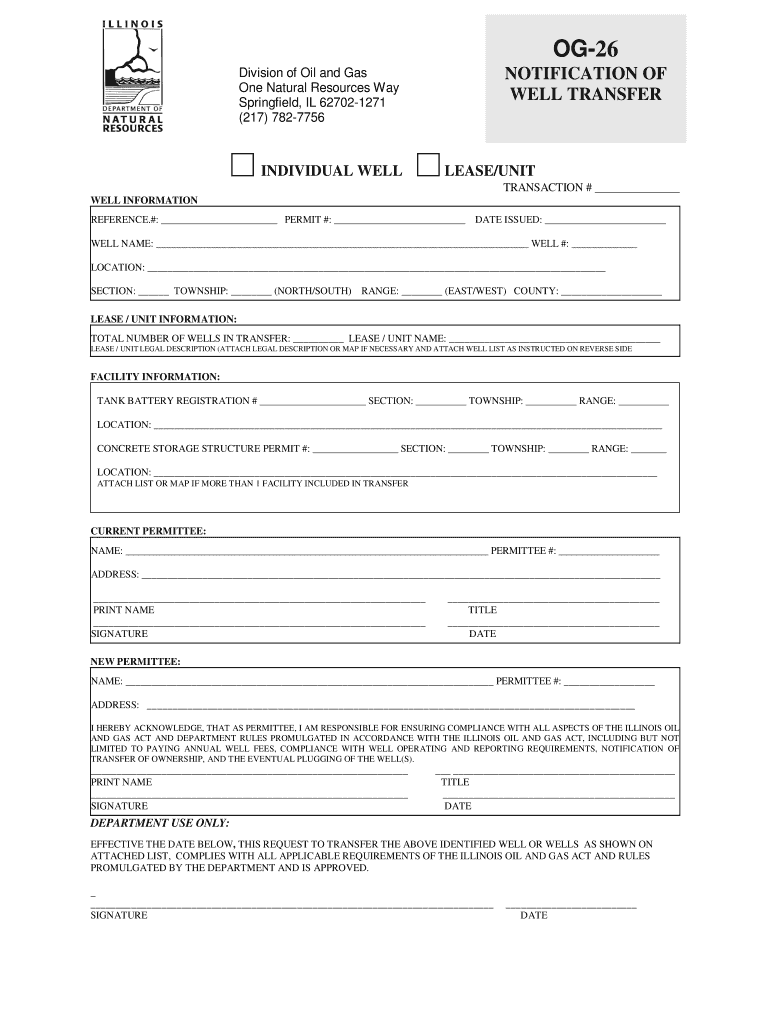 OG26 NOTIFICATION OF WELL TRANSFER Division of Oil and Gas One Natural Resources Way Springfield, IL 627021271 (217) 7827756 INDIVIDUAL WELL LEASE/UNIT TRANSACTION # WELL INFORMATION REFERENCE.#:
