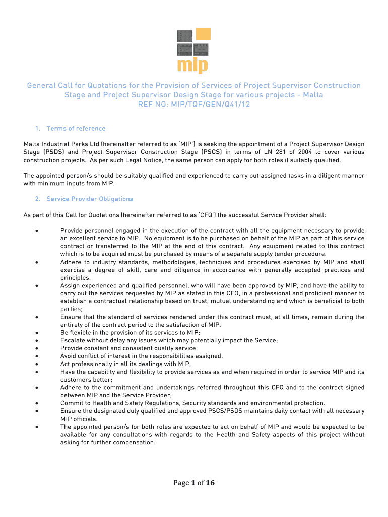 Get the free General Call for Quotations for Project Supervisor Services