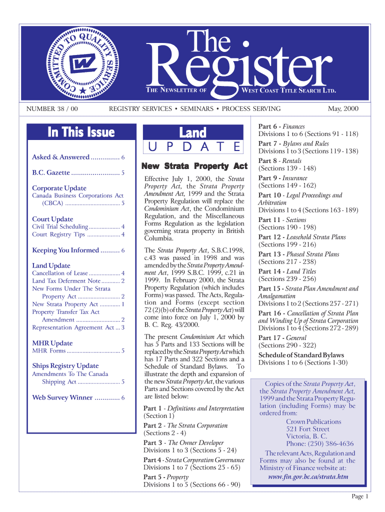 This newsletter serves to inform stakeholders about updates related to registry services, changes in legislation, court proceedings, and land property matters in British Columbia.