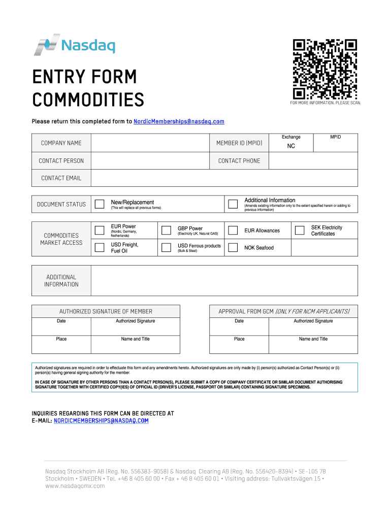 COMMODITIES ENTRY FORM COMMODITIES FOR MORE INFORMATION. PLEASE SCAN. Please return this completed form to NordicMemberships nasdaq.com Exchange COMPANY NAME MEMBER ID (MID) CONTACT PERSON MID CONTACT