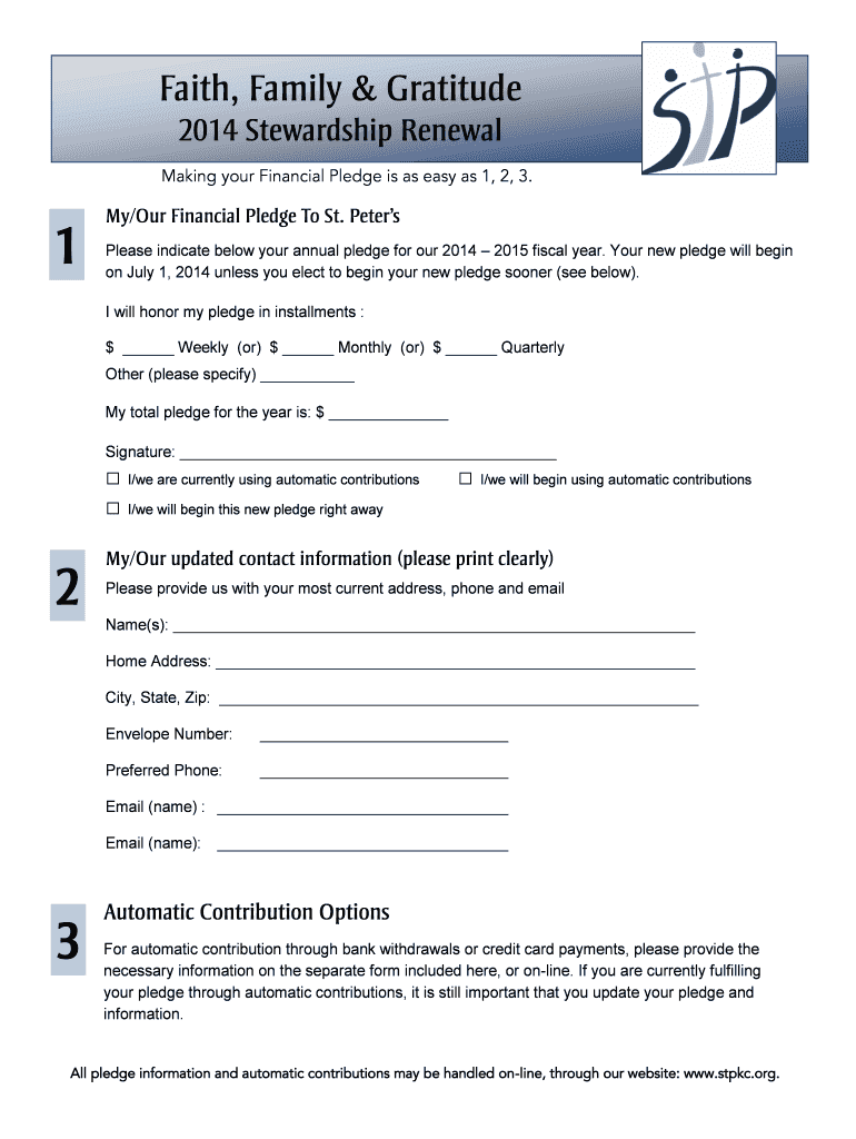 Faith, Family & Gratitude 2014 Stewardship Renewal Making your Financial Pledge is as easy as 1, 2, 3. 1 My/Our Financial Pledge To St. Peters Please indicate below your annual pledge for our 2014