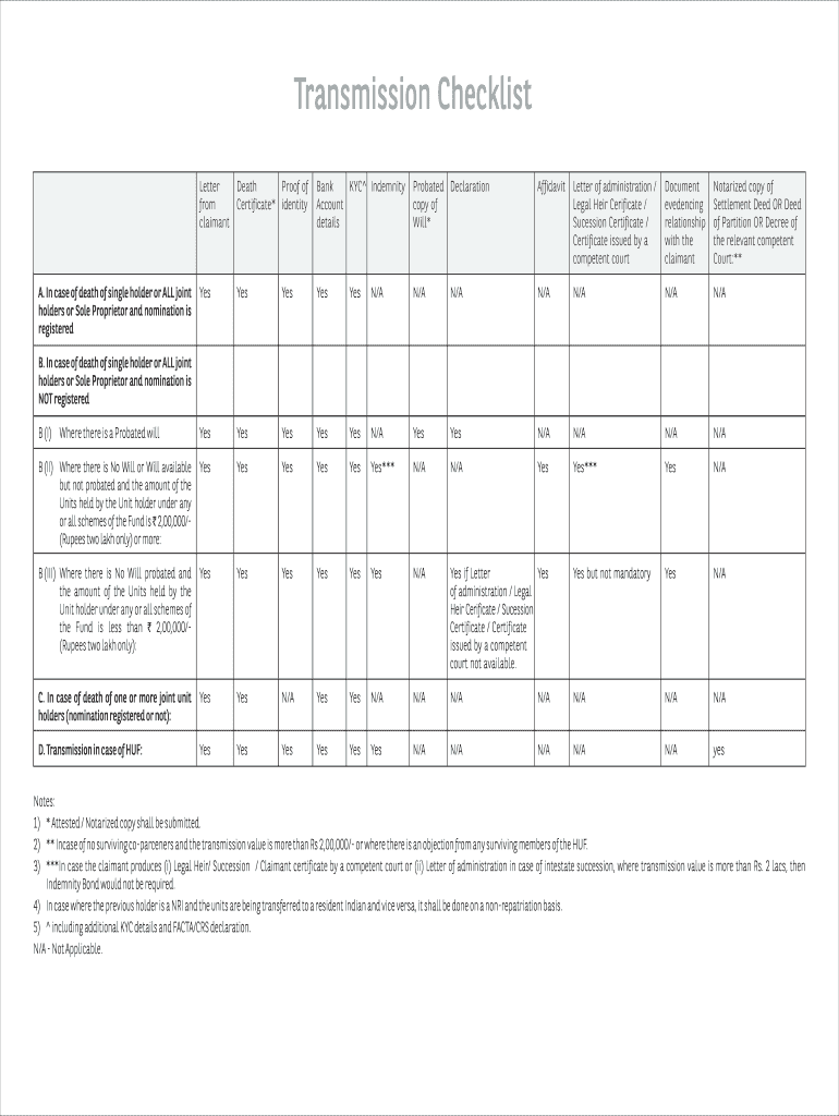 Transmission Checklist Death Proof of Letter from Certificate* identity claimant Bank KYC Indemnity Probated Declaration Account copy of details Will* Affidavit Letter of administration / Legal Heir