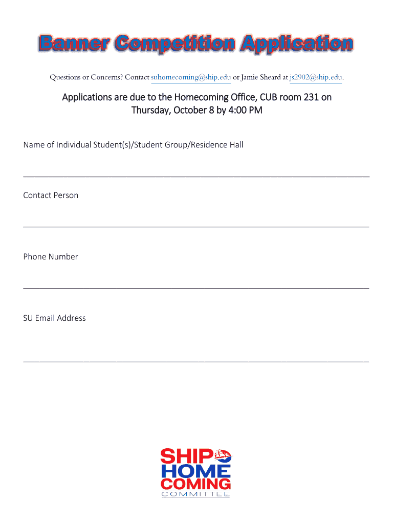 Questions or Concerns? Contact homecoming ship.edu or Jamie Shared at js2902 ship.edu. Applications are due to the Homecoming Office, CUB room 231 on Thursday, October 8 by 4:00 PM Name of Individual
