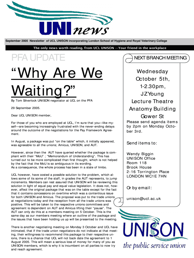 September 2005 Newsletter of UCL UNISON incorporating London School of Hygiene and Royal Veterinary College The only news worth reading, from UCL UNISON Your friend in the workplace PFA UPDATE Why
