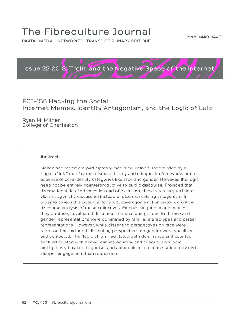 DIGITAL MEDIA + NETWORKS + TRANSDISCIPLINARY Critiques: 14491443issue 22 2013: Trolls and the Negative Space of the InternetFCJ156 Hacking the Social: